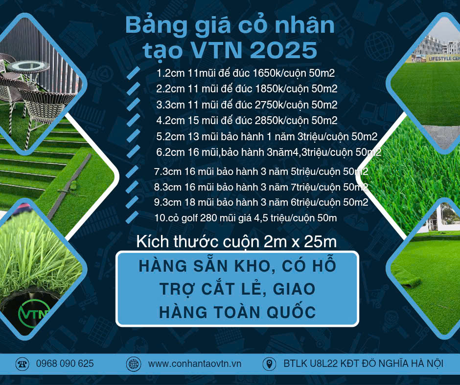 Cỏ sân sân vườn tại hà tĩnh có các thông số cỏ cao 1cm, 2cm, 3cm. Phù hợp mọi nhu cầu của khách hàng sau đây là bảng giá cỏ nhân tạo sân vườn để quý khách hàng tham khảo. Gía sẽ thay đổi theo từng thời điểm. Qúy khách LH trực tiếp ZALO 0968090625
